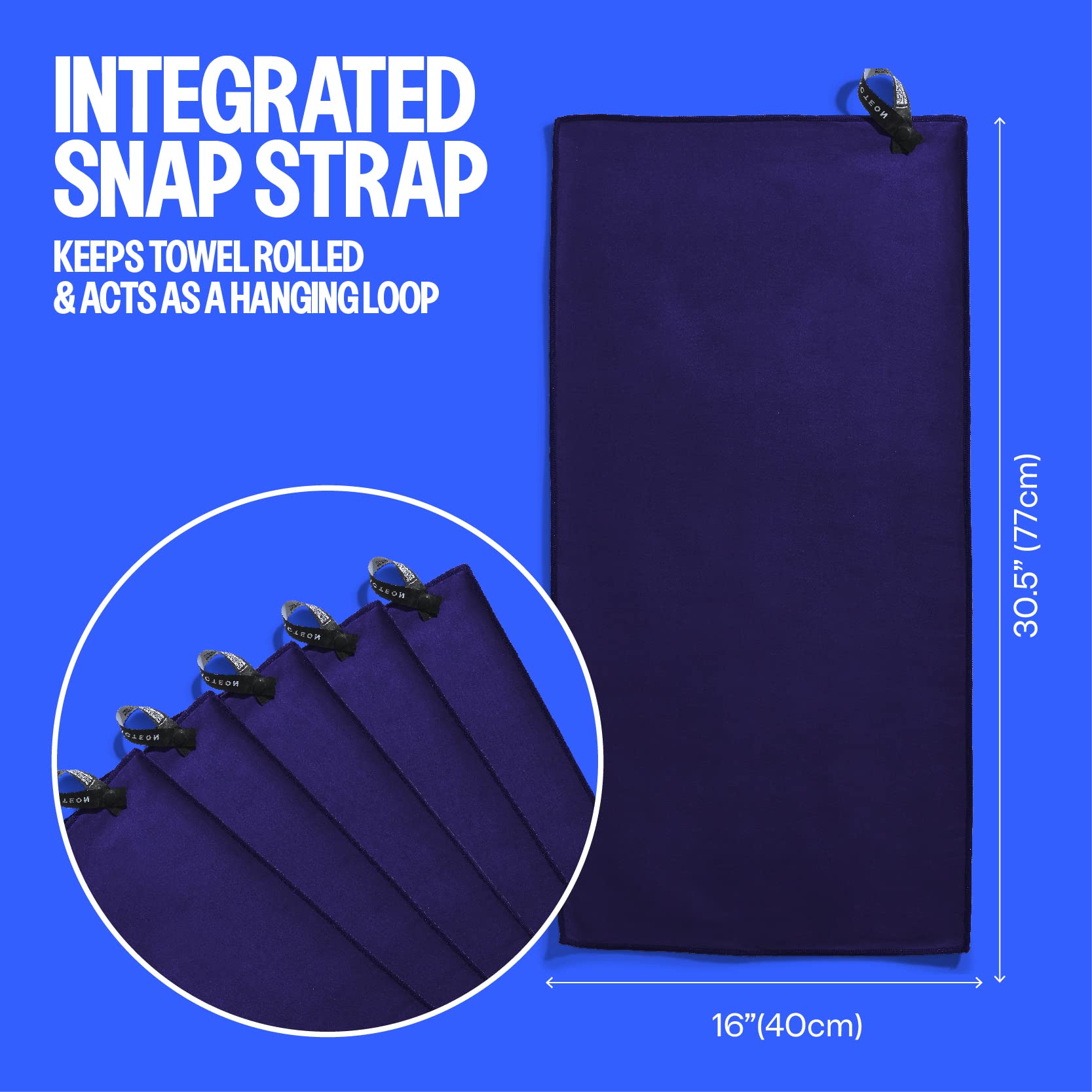 - ULTRA COMPACT, LIGHTWEIGHT, STAY CLEAN WITH HANGING LOOP: With an integrated snap strap closure that doubles as a hanging loop over the door, your backpack, or bottle. the large thin towel rolls up into a packable travel-friendly size. Perfect for anyone who travels light.