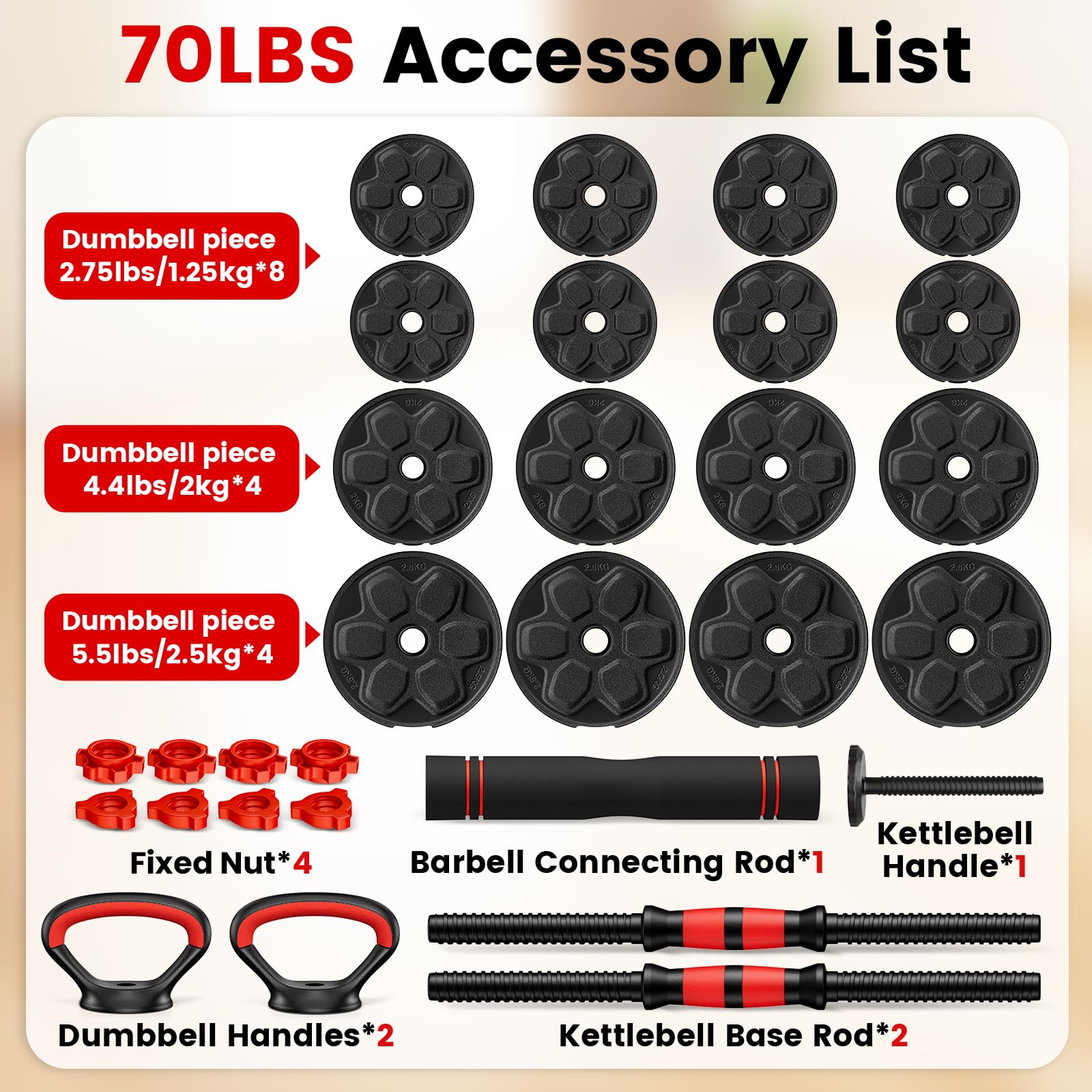 - 【Free Choice of Weight】The weight set's detachable design increases the flexibility of use. the single dumbbell is adjustable from 5-22 lbs, barbells: 8-47 lbs, and kettlebells: 5-23lbs. Effectively meeting your different exercise needs during various stages.Installation is simple.