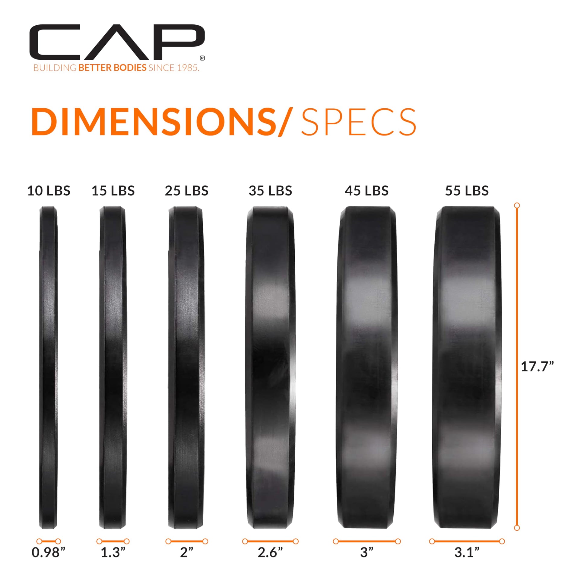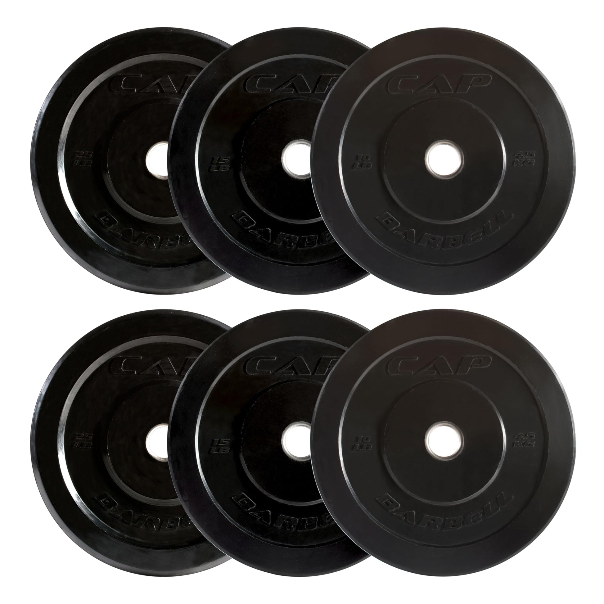 Details: The CAP Barbell Elite Bumper Plate Set offers protection for both the barbell and the bumper plates with its sound construction. The steel insert hubs reinforce the holes and protect the bar at the same time. This Olympic weight plate set can only be used with Olympic bars (with a 2-inch sleeve diameter). Each weight is made from solid cast iron and coated in virgin and recycled rubber. Adding weights to any fitness routine helps to increase muscle mass while burning more calories and reducing body fat. Add these Olympic bumper plates to your home gym and start experiencing the benefits they can offer to your fitness routine. 30-day manufacturer .