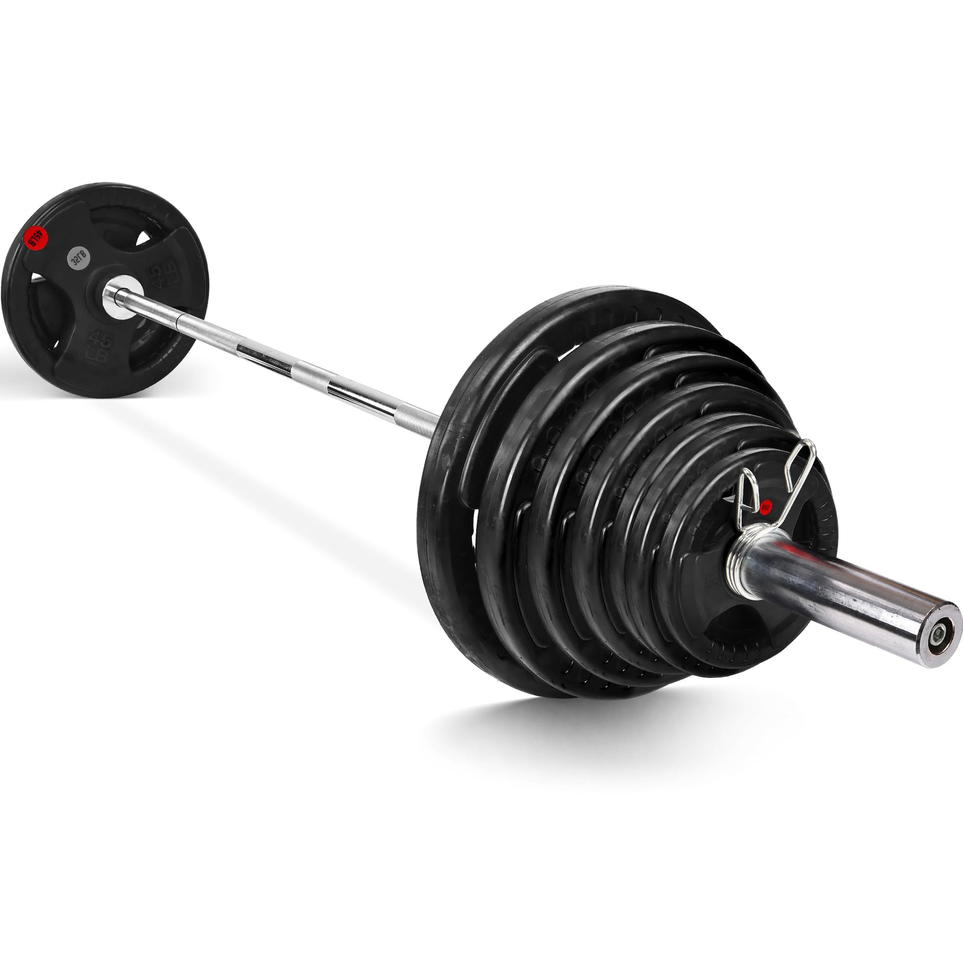 - 300 lbs Barbell Set Total: 1x 7-foot Olympic 2-inch barbell bar (45 lbs), 2x 2.5 lbs, 4x 5 lbs, 2x 10 lbs, 2x 25 lbs, 2x 35 lbs, 2x 45 lbs 2-inch cast iron weight plates.