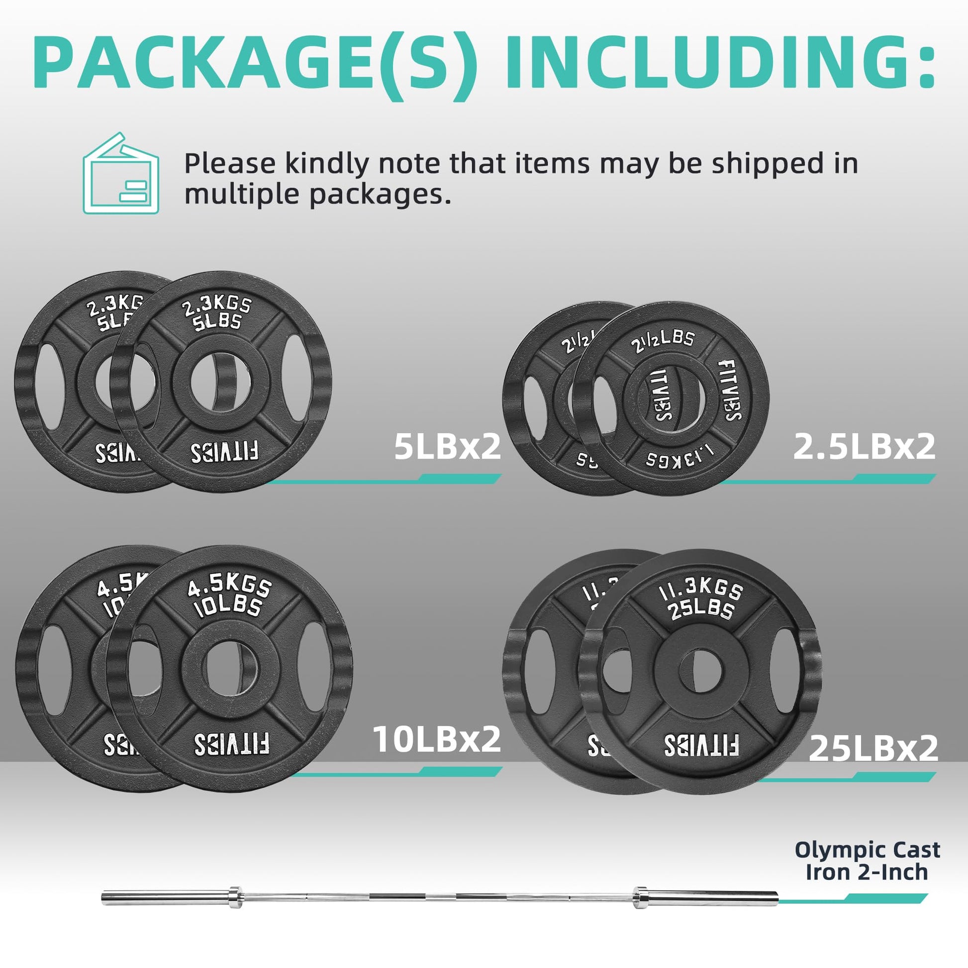 - 100 pounds set: 1x 5 feet Olympic Barbell Bar (15 lbs) & Safely Locks, 2x 2.5lbs, 2x 5lbs, 2x 10lbs, 2x 25lbs Cast Iron Plates.