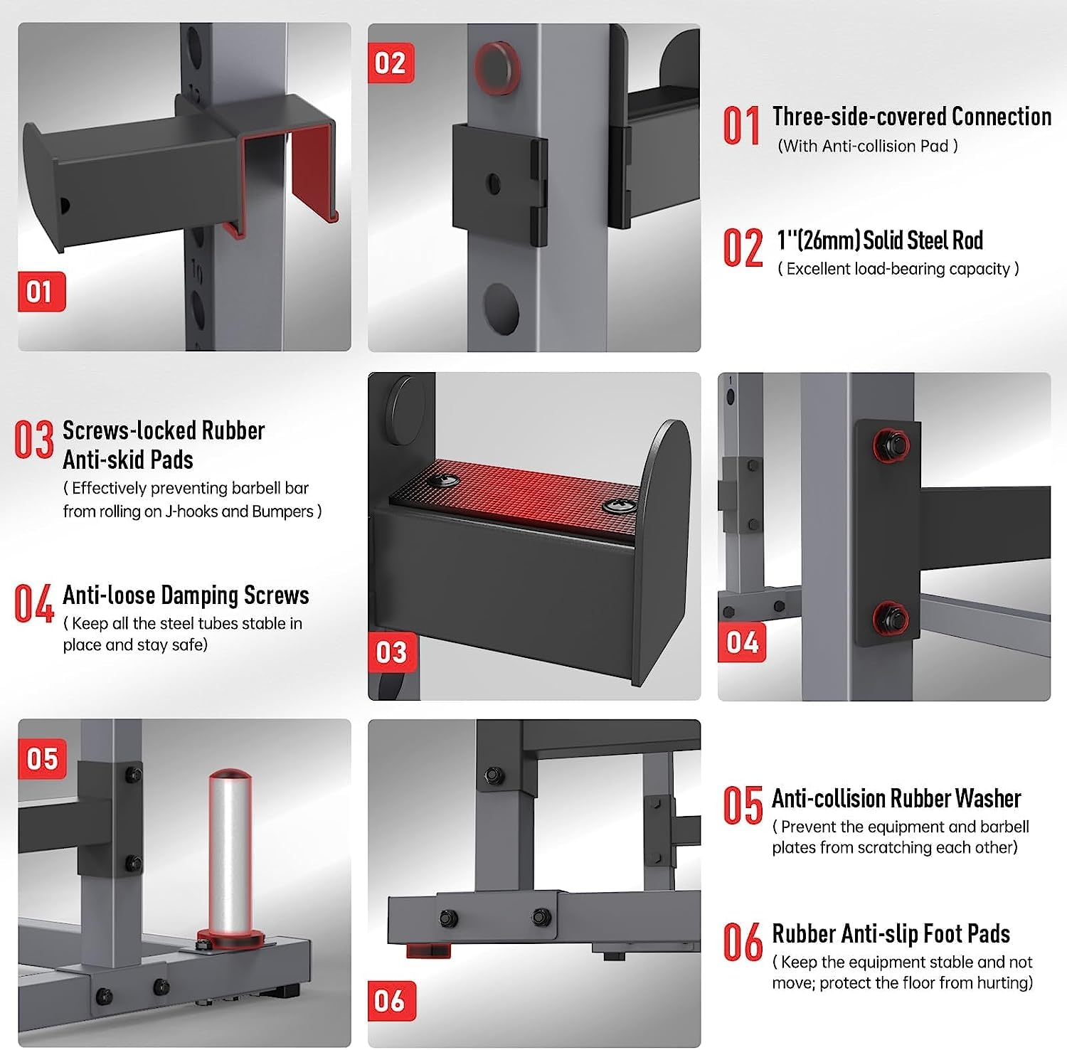 - 【 More Excellent Features 】- All the screws are damping screws, which are anti-loose and wear-resistant; With 4 anti-slip pads under the equipment, keep stable and protect the floor; With 2 barbell plate storage columns, the size is 50mm(2”), suitable for barbell plates with 50mm (2”) center hole.