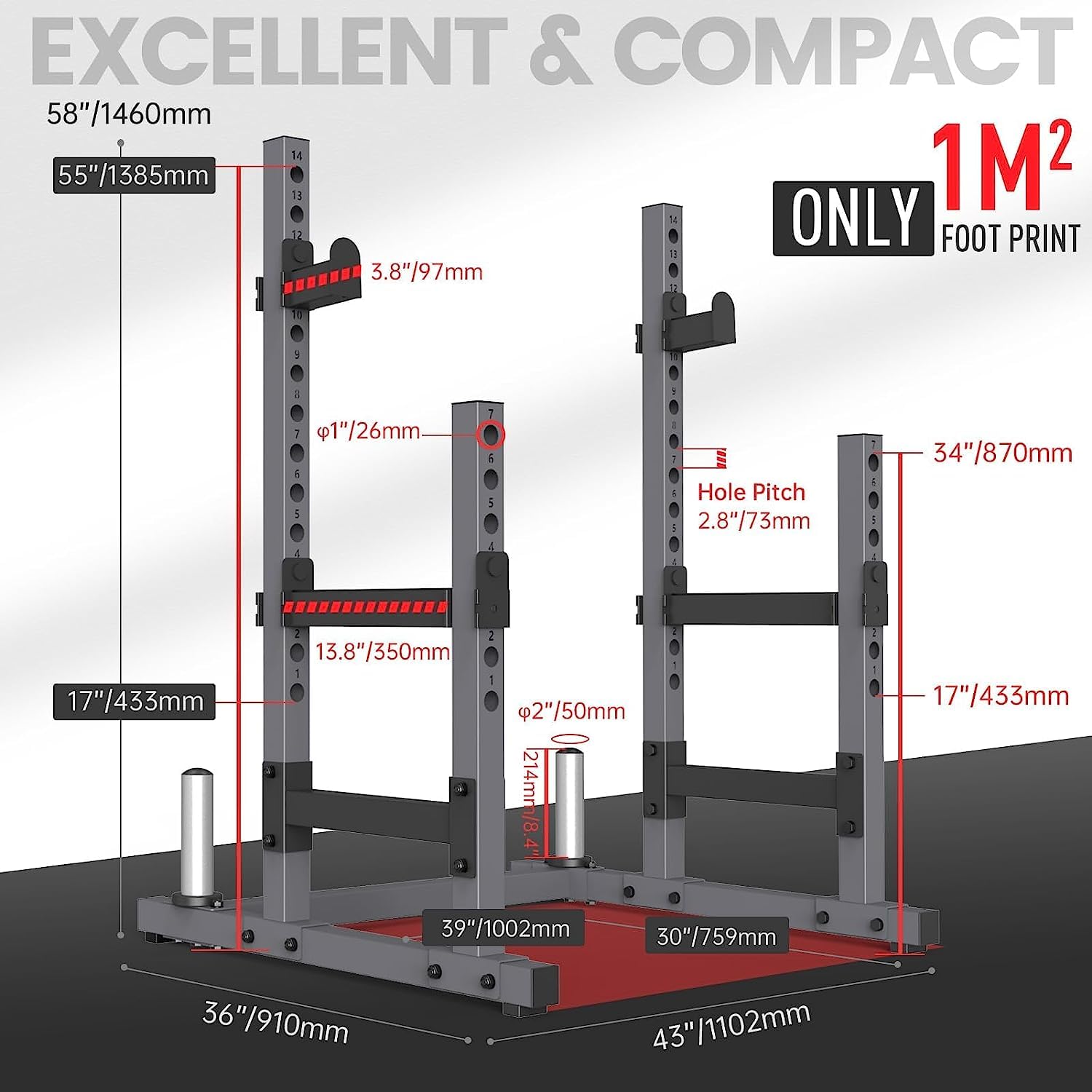 - 【 Wide Application 】- 14 positions for J hooks and 7 positions for bumpers allow you to perform various exercises at the level you feel comfortable. The height of highest position for J-hooks is 137.5cm(54”) ,and for bumpers is 86cm(33.8”). This item can be also called a bench press rack, we can also use it together with a weight bench to do barbell bench press workouts. Absolutely a great choice for your home gym!