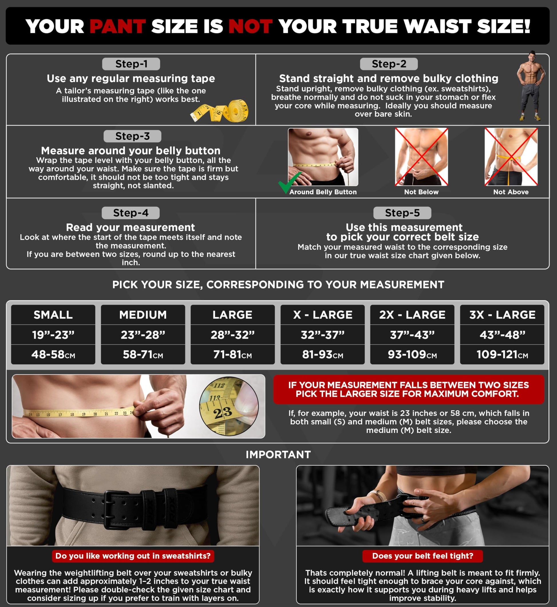 - DO NOT TRUST YOUR PANT SIZE – S (19”-23”), M (23”-28”), L (28”-32”), XL (32”-37”), 2XL (37”-43”), 3XL (43”-48”). Please ensure that you measure your size ACCORDING TO THE SIZE CHART AND THE MEASURING INSTRUCTIONS provided in the size chart. Measure around your lower back and across your belly button to find your TRUE BELT SIZE. Measurements taken at pant size would result in WRONG BELT SIZE. If your waist size falls between two sizes, please CHOOSE THE UPPER SIZE for maximum utility.