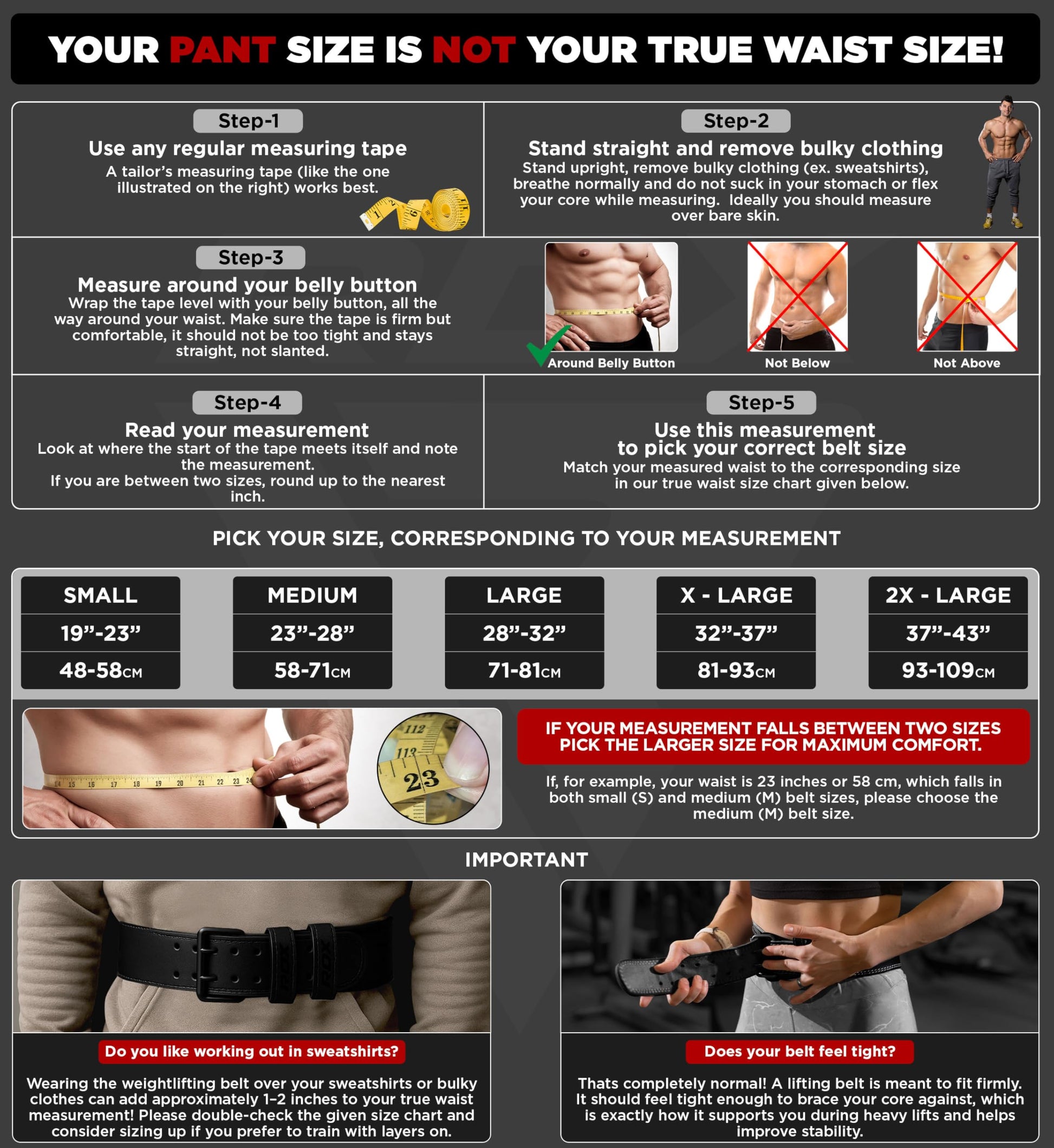- DO NOT TRUST YOUR PANT SIZE – S (19”-23”), M (23”-28”), L (28”-32”), XL (32”-37”), 2XL (37”-43”), 3XL (43”-48”). Please ensure that you measure your size ACCORDING TO THE SIZE CHART AND THE MEASURING INSTRUCTIONS provided in the size chart. Measure around your lower back and across your belly button to find your TRUE BELT SIZE. Measurements taken at pant size would result in WRONG BELT SIZE. If your waist size falls between two sizes, please CHOOSE THE UPPER SIZE for maximum utility.