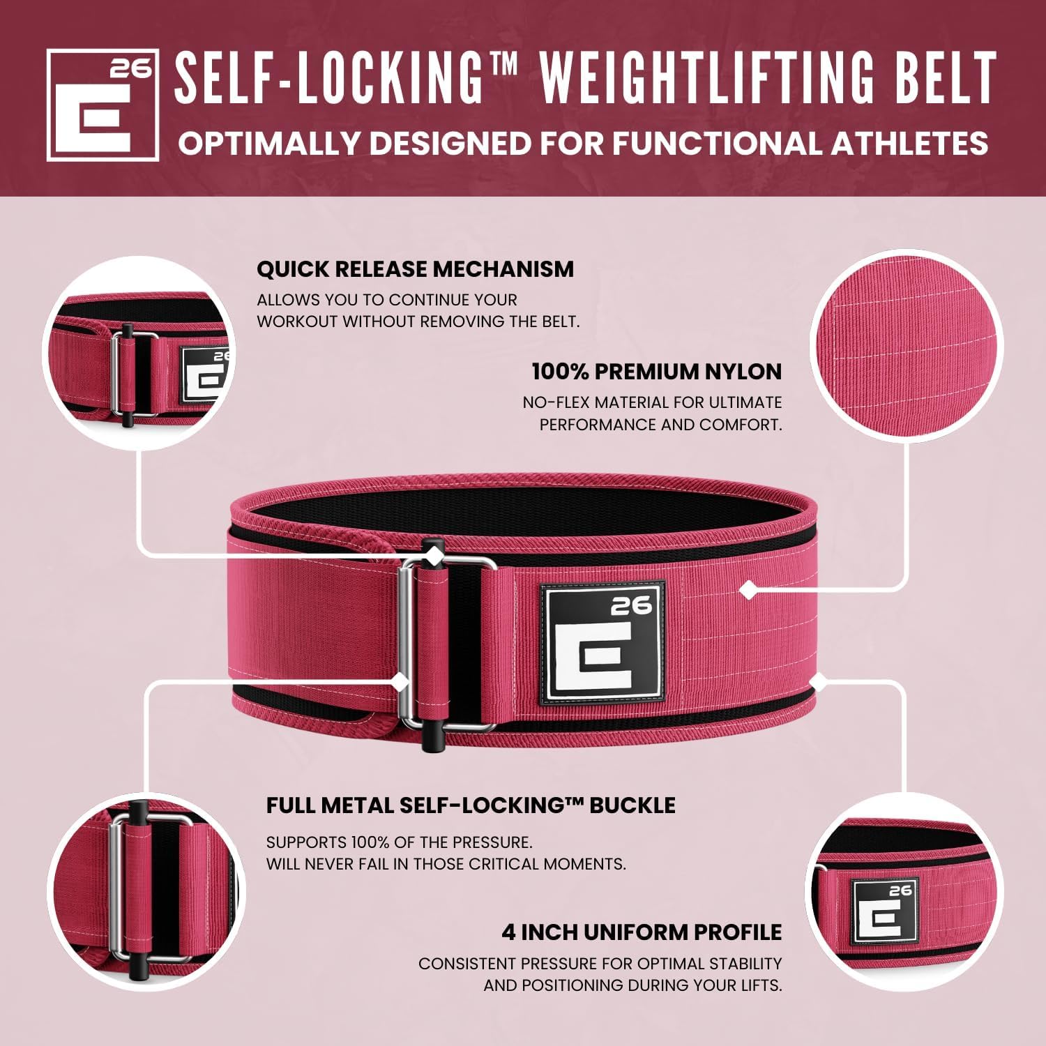 - BUILT FOR PERFORMANCE: The E26 Self-Locking Belt is made from 100% Premium Nylon, Full Metal Self-Locking Buckle, doesn’t have silly padded inserts and mesh coverings which result in unequal distribution of pressure during your lifts and designed with only one purpose in mind… ultimate performance for functional fitness athletes.