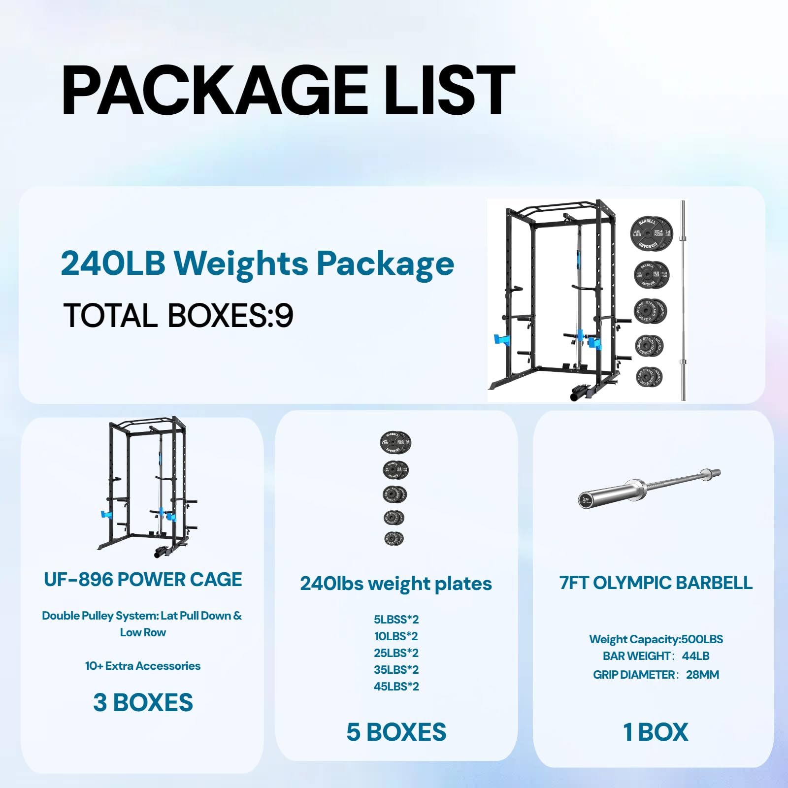 Details: Multi-Functional Power Rack Cage Pulley System Home Gym Equipment with J-Hooks, Dip Handles, Landmine Attachment with 240LBS Weight plates and Olympic Bar