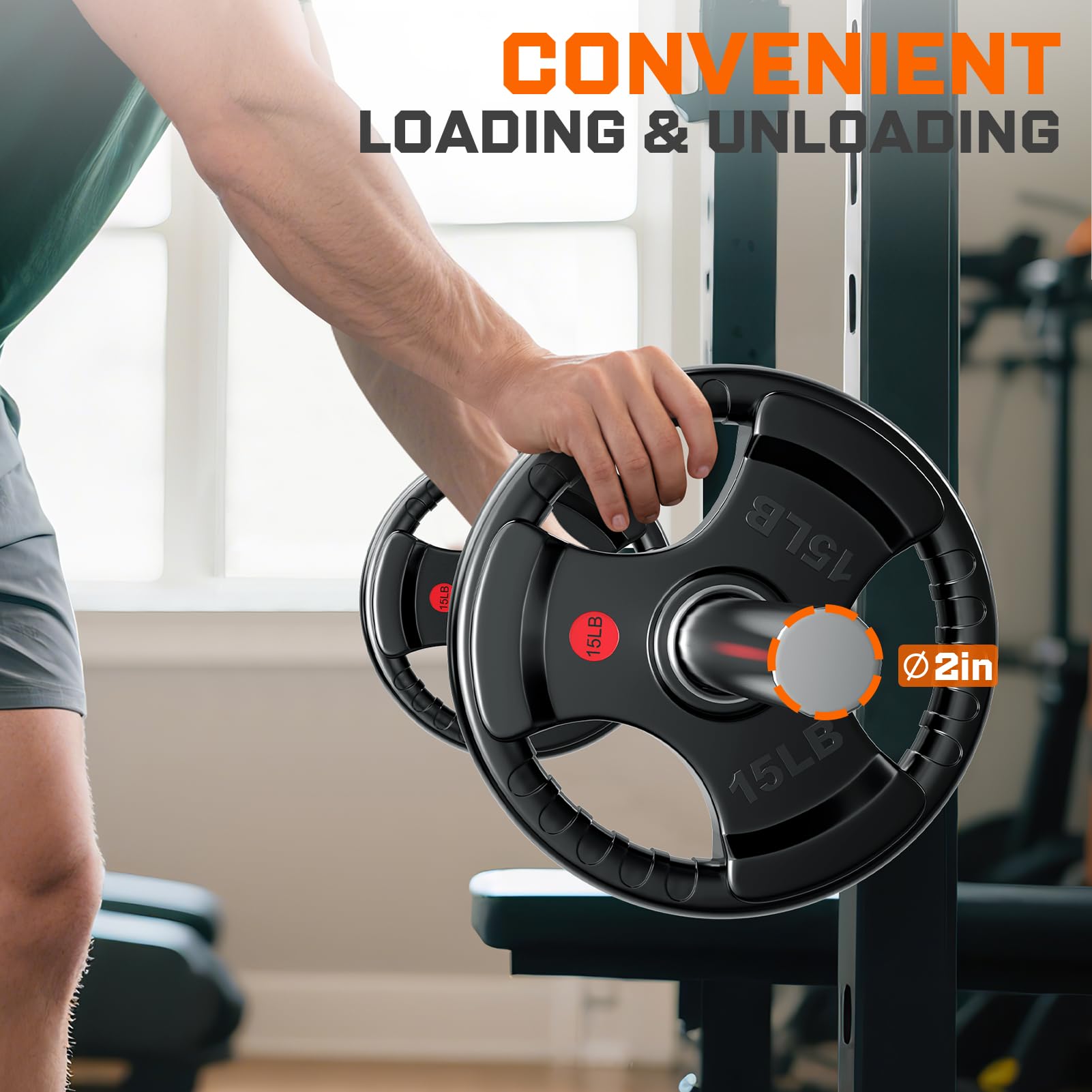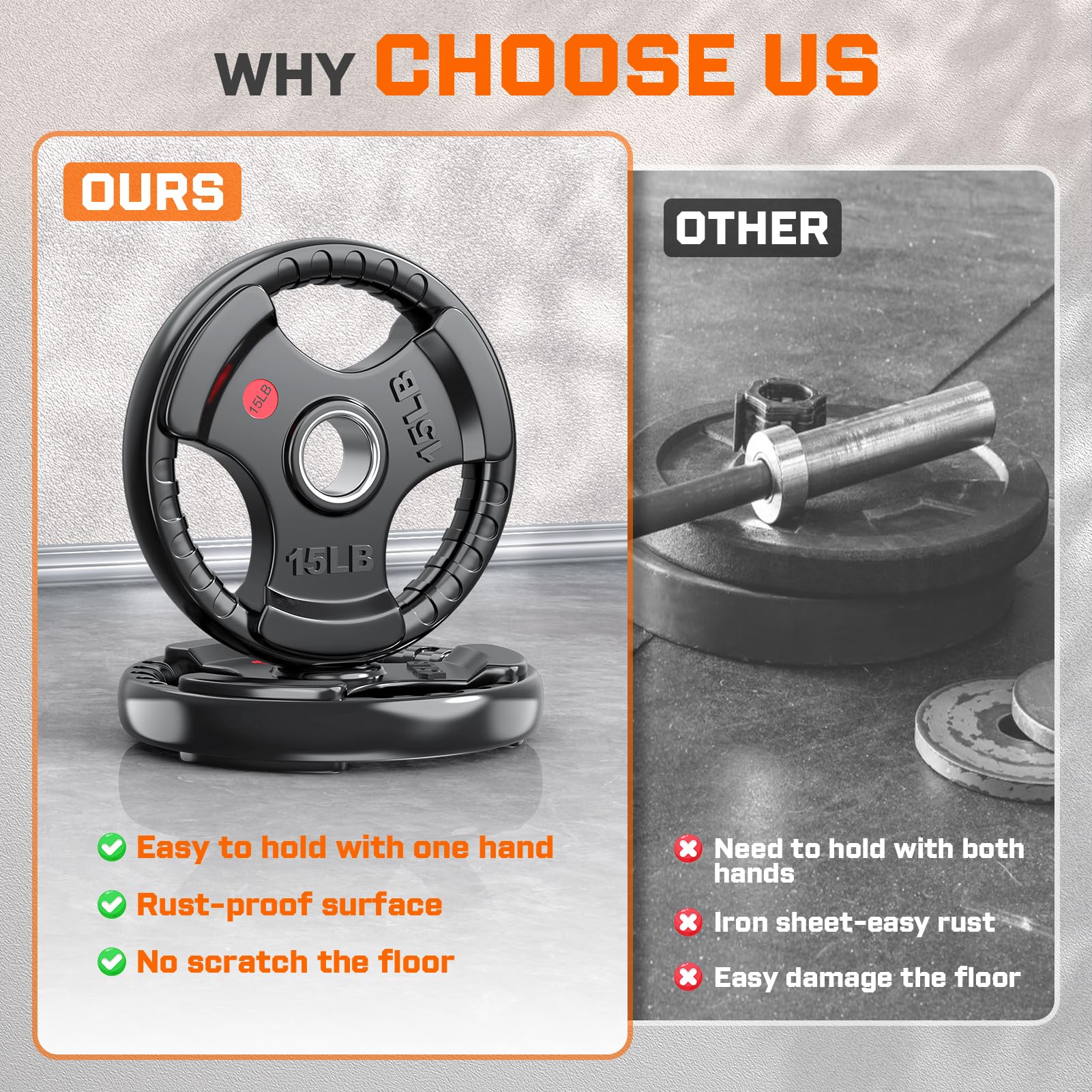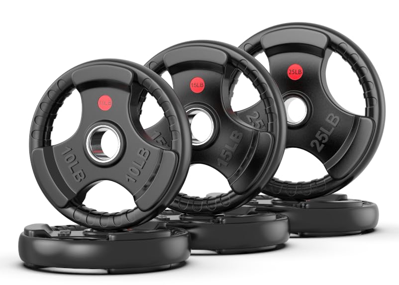 - EASY GRIP – The Olympic weight plates is designed with three holes and there are grooves in the grip holes for easy and safe handling when loading and unloading heavy objects. Descending and lowering after weight training is safer and more practical. The comfortable grip also gives you a good using experience